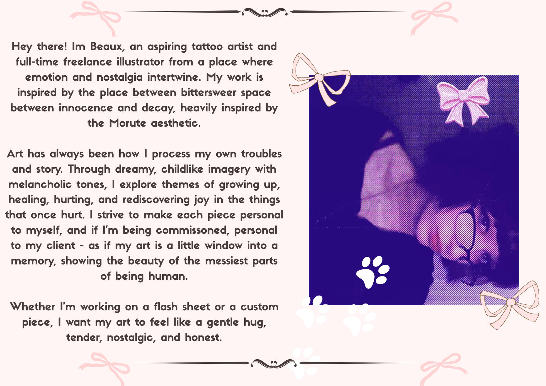 Currently, I specialise in commissioned art, ranging tattoo designs, to character sheets, to mugs and stickers etc. My Etsy and Ko-Fi are open!